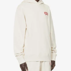 - Relaxed fit, hood, long sleeves, embroidered brand patch at sleeve, brand print at front and back, kangaroo pocket at front, ribbed trims