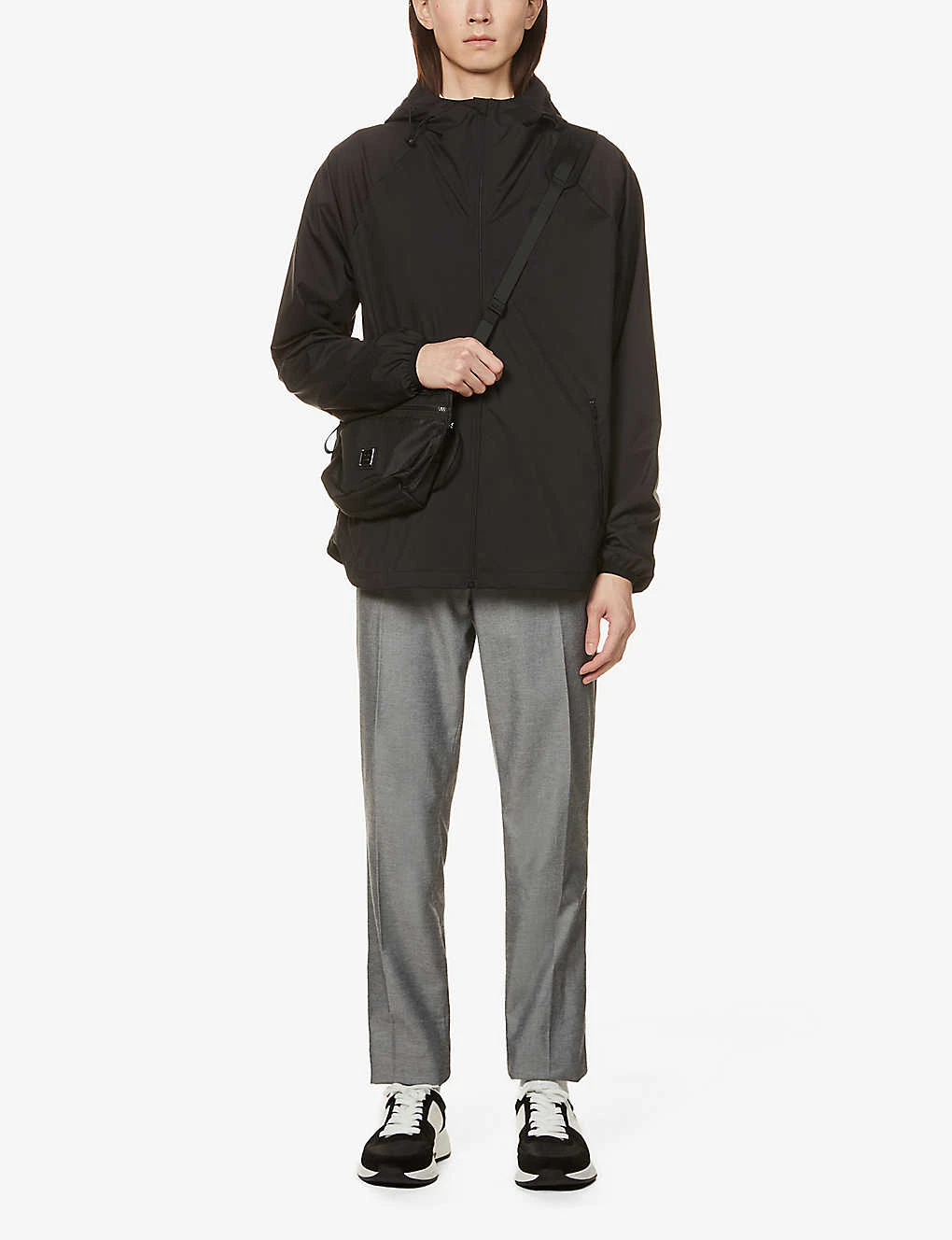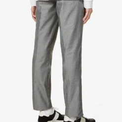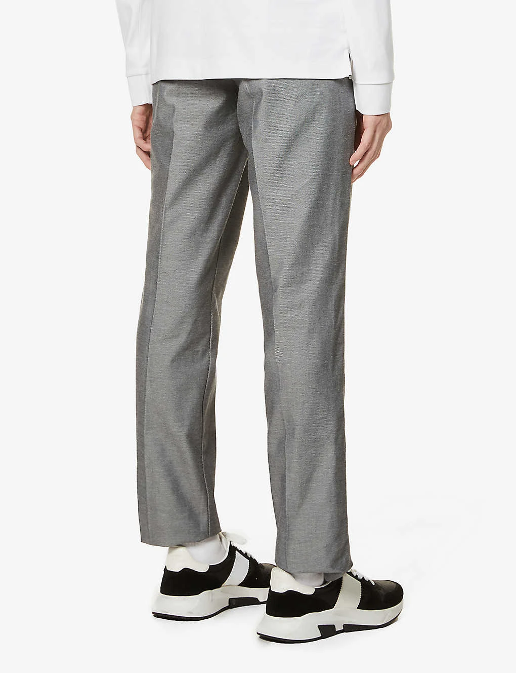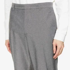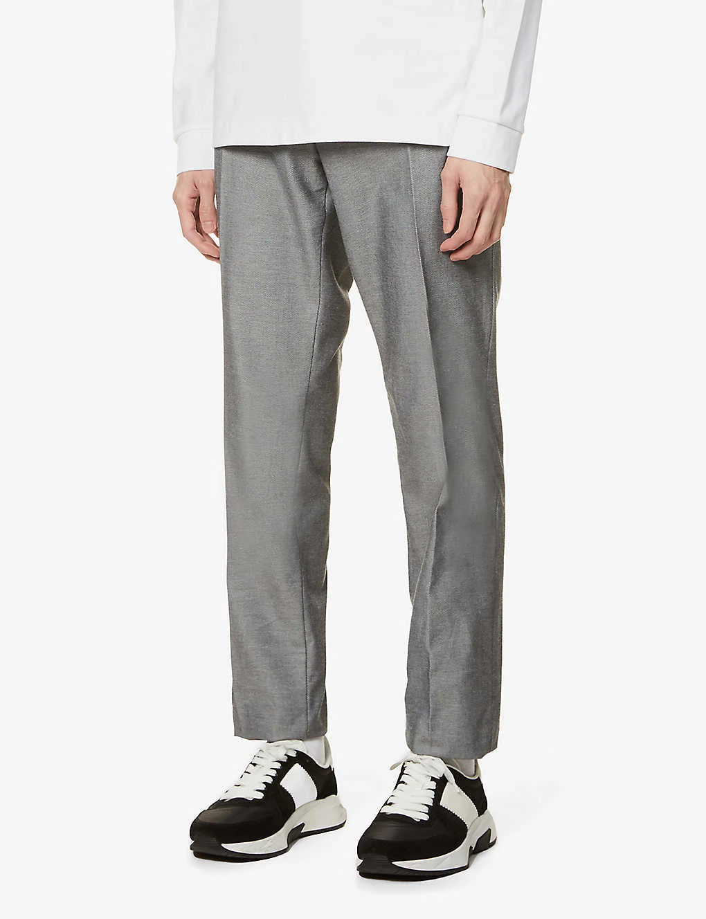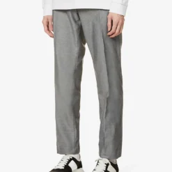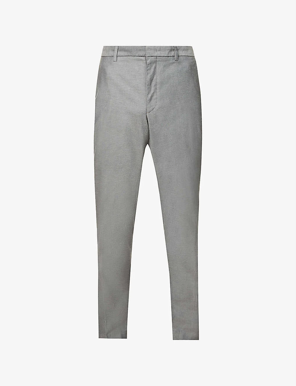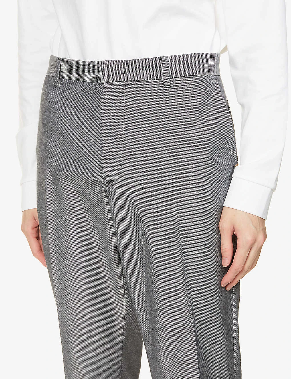 - Slim fit, tapered leg, regular rise, belt loops, side pockets, back welt pockets, branded tag at rear pocket, front centre creases
