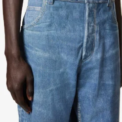 - Relaxed fit, mid-rise, straight leg, belt loops, five pockets, contrast stitching, silver-toned hardware, all-over denim design, partially lined
