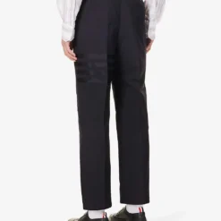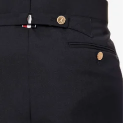 - Regular fit, mid-rise, straight leg, structured waistband, two slip pockets at sides, pressed centre creases at front and back, striped pattern at leg, buttoned waist adjuster at back, darts at back, two buttoned jetted pockets at back, gold-toned branded hardware, partially lined – Unfinished hems, ready for tailoring
