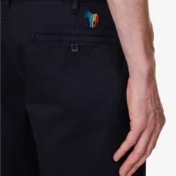 - Regular fit, mid-rise, structured waistband with belt loops, two slip pockets at front, darts at back, two welt pockets at back, brand embroidery at back, diagonal woven texture