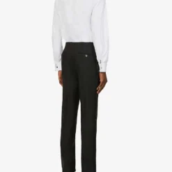 - Regular fit, mid rise, straight leg, slip pockets, contrast-texture stripe at sides, pressed centre creases at front and back, two buttoned-jetted pockets at back, unfinished hems ready for tailoring