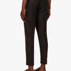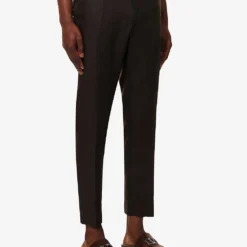 - Regular fit, mid-rise, tapered leg, belt loops, two slip pockets at sides, pressed centre creases at front and back, brand patch at back, two buttoned jetted pockets at back, partially lined
