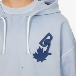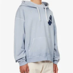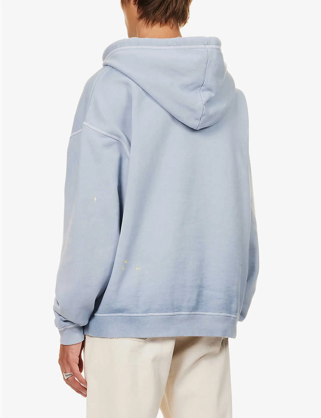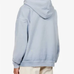 - Relaxed fit, crewneck, drawstring hood, dropped shoulders, long sleeves, brand patch at chest, kangaroo pocket at front, exposed seams, faded wash and paint splatters, ribbed trims