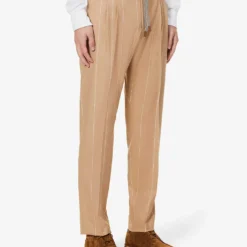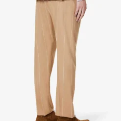 - Regular fit, mid-rise, straight leg, drawstring waistband, belt loops, two slip pockets at front, pleats at front, pressed centre creases, two buttoned welt pockets at back, all-over striped pattern – Unfinished hems, ready for tailoring