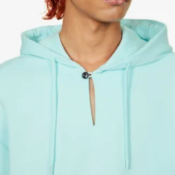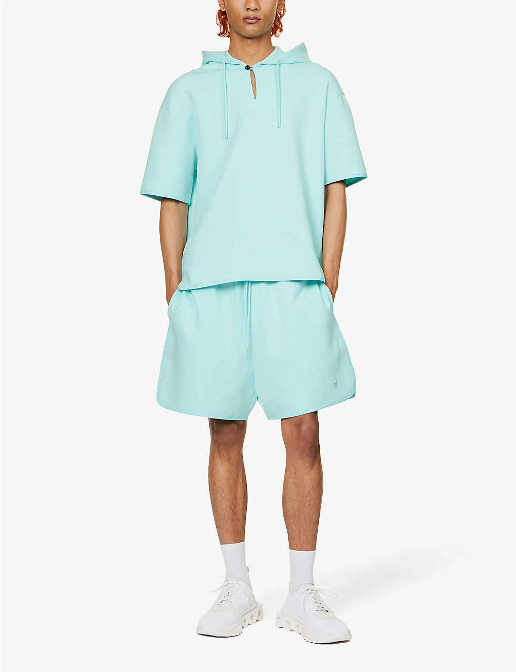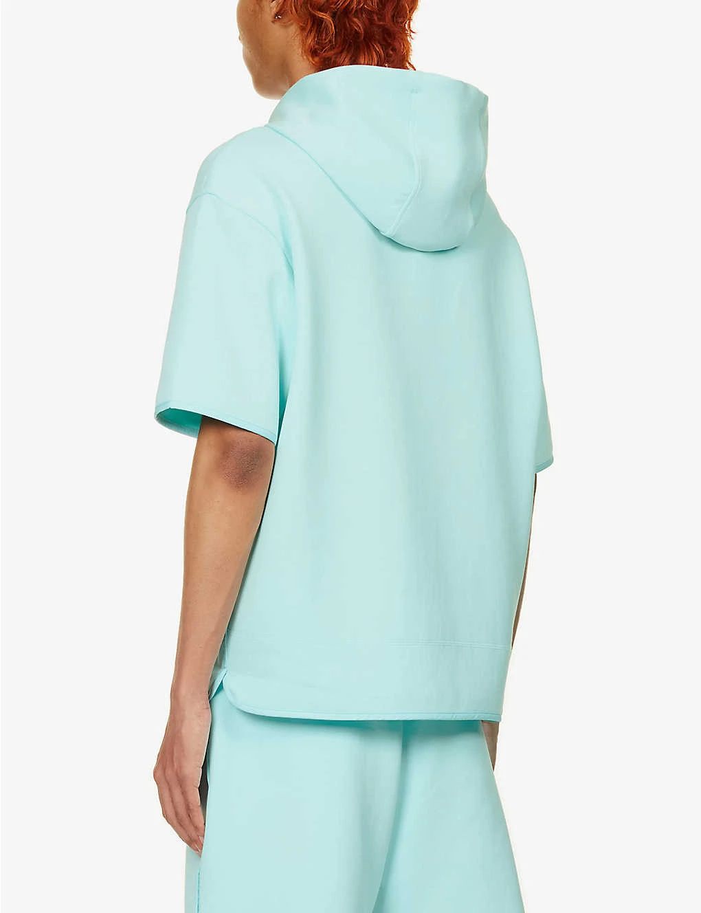 - Relaxed fit, drawstring hood, dropped shoulders, short sleeves, embroidered branding at front, exposed seams, stepped hem