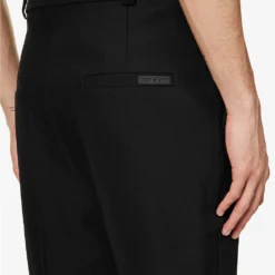 - Regular fit, mid-rise, tapered leg, belt loops, two slip pockets at front, pleats at front, centre pressed creases at front and back, darts at back, two welt pockets at back, brand patch at back