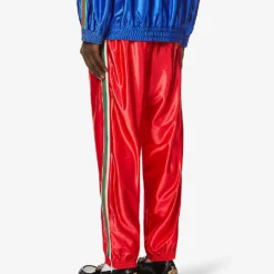 - Relaxed fit, mid-rise, tapered leg, drawstring elasticated waistband, slip pockets at sides, contrasting striped panel at side leg, contrasting piping, patch pocket at back, branded patch at back pocket, zipped elasticated cuffs, shiny finish