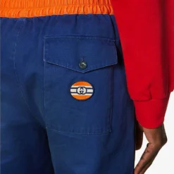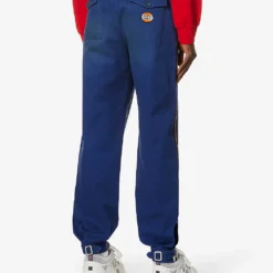 - Relaxed fit, mid-rise, tapered leg, slip pockets at sides, faded wash, patch pockets at back, branded patch at back pocket, striped trim at side legs, buckle-belt cuffs