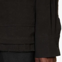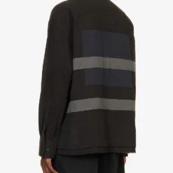 - Relaxed fit, long sleeves, pleated cuffs, patch pocket at chest, two slip pockets at sides, all-over contrast panels and harness design, frayed hem