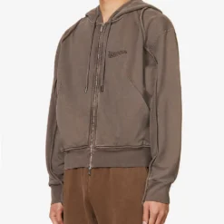 - Boxy fit, drawstring hood, dropped shoulders, long sleeves, chunky strap embellishments at sleeves, embroidered branding at chest, split kangaroo pockets at front, two-way zip fastening, silver-toned hardware, ribbed trims