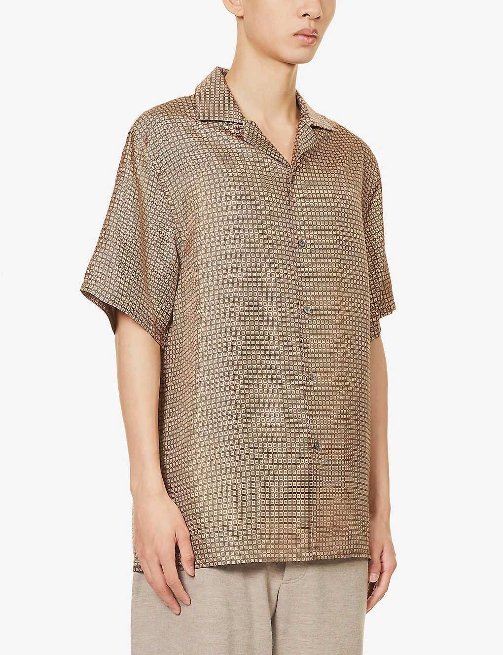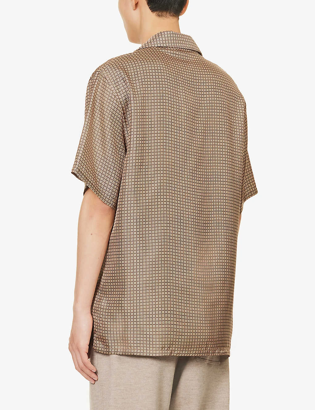 - Boxy fit, short sleeves, branded buttons, all-over geometric pattern, satin finish