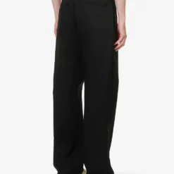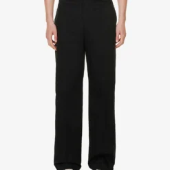 - Relaxed fit, mid-rise, belt loops, contrast branded waistband, two slip pockets at sides, pressed centre creases at front and back, darts at back, two buttoned welt pockets at back, partially lined