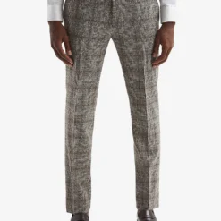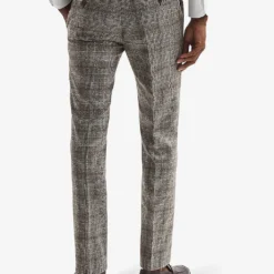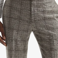 - Slim fit, straight leg, mid-rise, belt loops, side adjusters at side waist, two slip pockets at sides, pressed traveller’s crease at front, all-over Prince of Wales-check pattern, lined