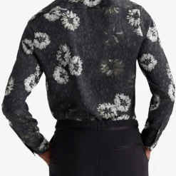 - Long sleeves, buttoned cuffs, all-over floral print, curved hem