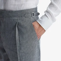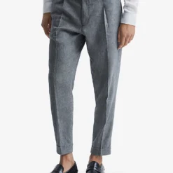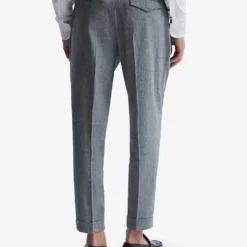 - Regular fit, tapered leg, mid-rise, cropped leg, turned-up cuffs, pressed centre creases, adjustable waistband, front pleats, two side slip pockets, back flap pocket