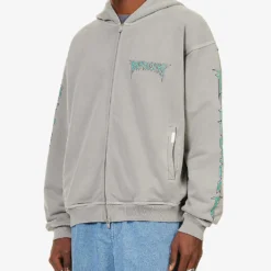 - Regular fit, hood, long sleeves, brand text print at chest, sleeves, two slip pockets at front, brand engraved plaque at pocket, faded wash, ribbed trims