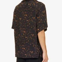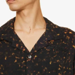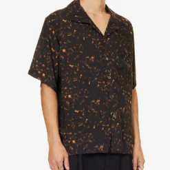 - Boxy fit, dropped shoulders, short sleeves, embroidered branding at chest, patch pocket at chest, pearlescent branded buttons, all-over tortoise-shell pattern, split hem at sides