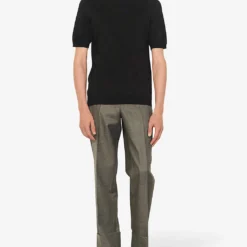 - Mid rise, tapered leg, elasticated back waistband, two slip pockets at sides, one welt pocket at back, pressed traveller’s crease at front