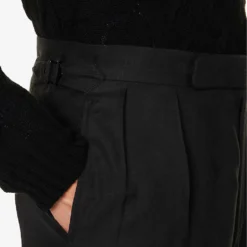 - Slim ft, mid-rise, straight leg, epaulettes at waistband, two slip pockets and pleats at front, two buttoned pockets at back, pressed creases at front and back, straight cuffs