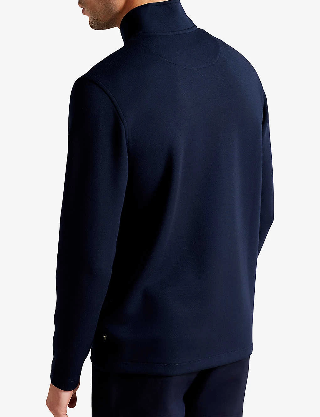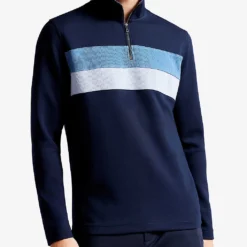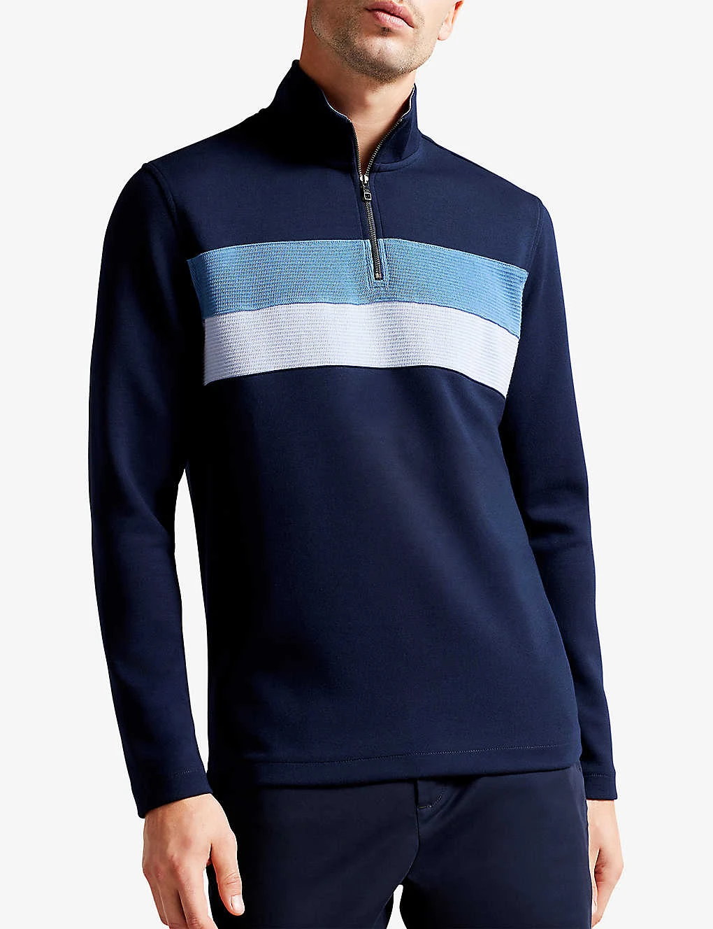 - Funnel neck, 1/4 zip, long sleeves, ribbed trims, contrasting striped panel across the chest