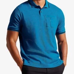 - Polo collar, short sleeves, regular fit, patch pocket at chest with T detail, stripe at collar and cuffs, notched hem