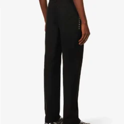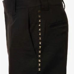 - Regular fit, mid-rise, straight leg, belt loops two slip pockets at sides, pressed centre creases at front and back, stud embellishments at back, darts at back, two welt pockets at back, partially lined